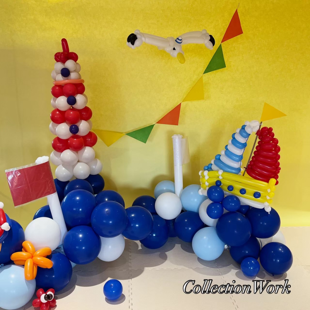 7月号の表紙を飾る「マリンサマー」をイメージしたバルーン装飾です。灯台やヨットなど、細部までこだわり、様々な種類のバルーンで表現。ご予算の中で、お客様のイメージを引き出す工夫を凝らしています。